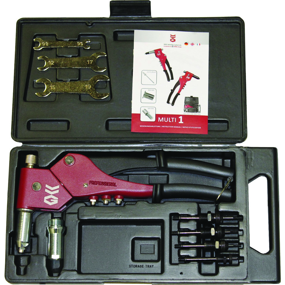 Lieferumfang: Handnietzange Multi 1 mit je einem Umrüstsatz M4, M5